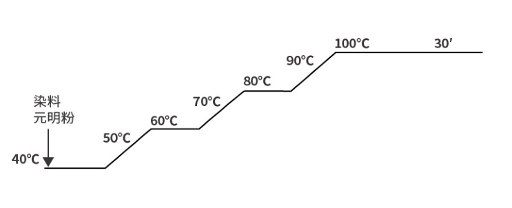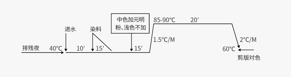 注:視設(shè)備不同,工藝需參照調(diào)整,本工藝適用于溢流、汽液、汽流設(shè)備染色。
